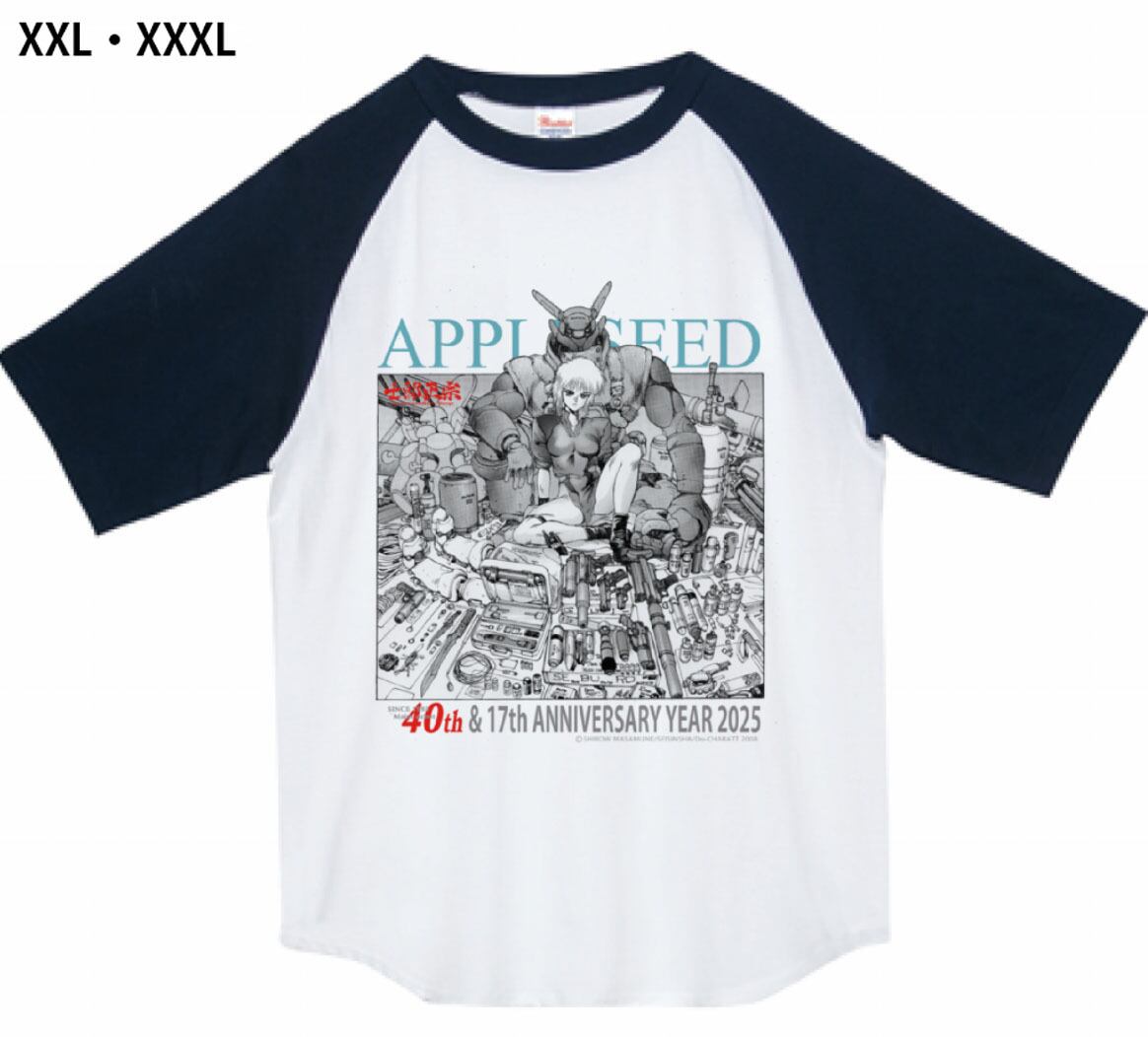 士郎正宗・漫画デザインTシャツVol.02 XXL・XXXL アップルシード ブリアレオス&デュナン 綿100% ラグランTシャツ。ホワイト×ネイビー